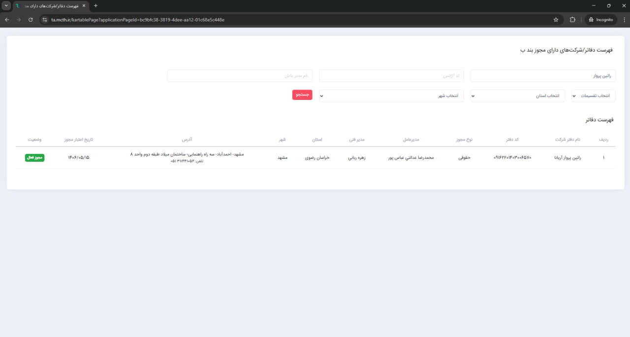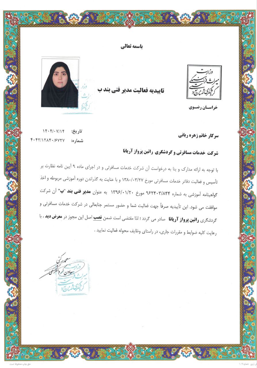 مجوز فعالیت شرکت راتین پرواز آریانا